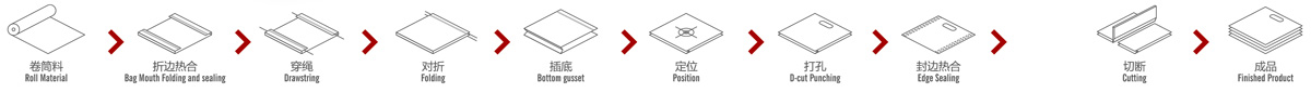 工序流程: 卷筒料---- 折邊---- 穿繩---- 熱合---- 對(duì)折---- 插邊---- 定位----- 打孔---- 熱合---- 切斷- 收集成品。